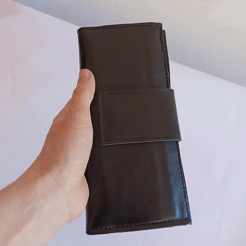Billetera: en el exterior idéntico Cuero que el bolso; en su interior combina cuero y gamuza al tono. Posee un bolsillo con cierre y dos compartimentos para billetes y cuatro para tarjetas. Cierra a través de broche imán. Medidas: 20 x 10 cm