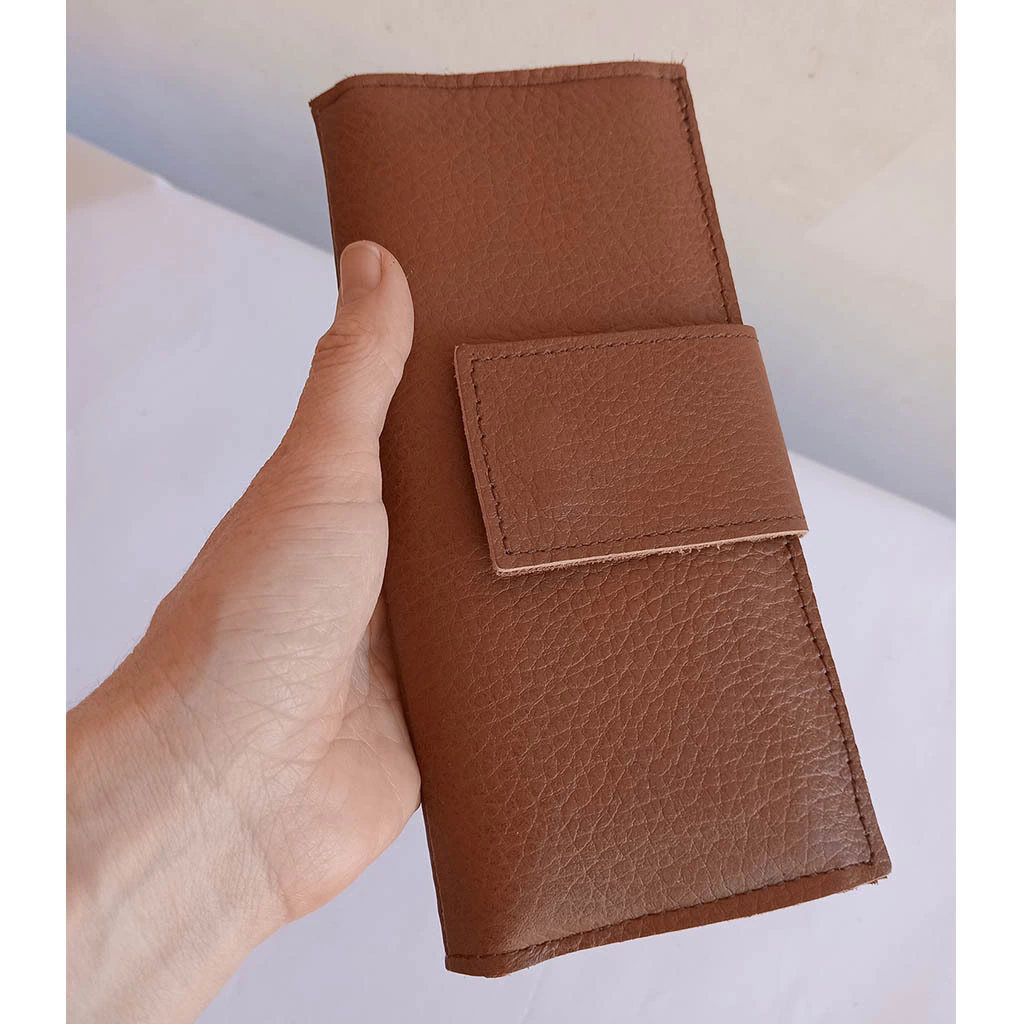 Billetera: en el exterior idéntico Cuero que el bolso; en su interior combina cuero y gamuza al tono. Posee un bolsillo con cierre y dos compartimentos para billetes y cuatro para tarjetas. Cierra a través de broche imán. Medidas: 20 x 10 cm